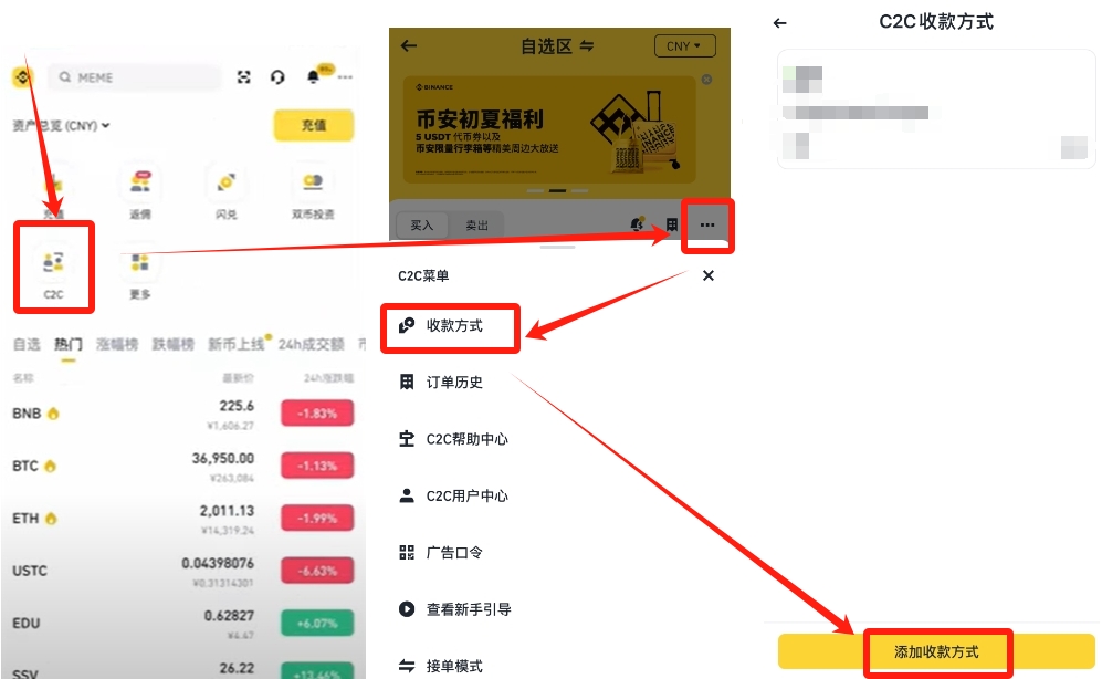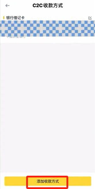 回到主页,我们就能够直接在主页看到C2C,其他的功能也能同样的操作把它放到主页上。点击【C2C】进入到法币交易的页面。C2C就是个人都按个人的收款方式,是大陆币圈比较常用的充值方式。我们要先添加一个收款方式,才能正常的充值和提现。点击右上角的三个点,选择【收款方式】,点击下边的【添加收款方式】。