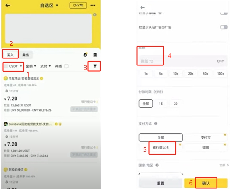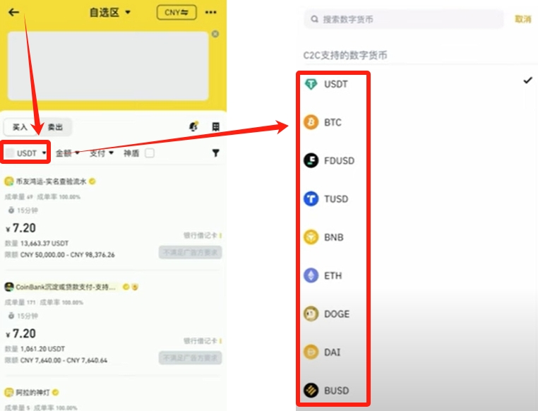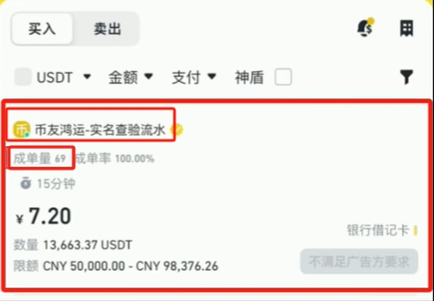 后面还有一个【神盾】。点击后面的小框,勾选上以后就是神盾商家。神盾商家都是在币安平台交了10万美金的押金的。而且他从这里买币或者卖币被冻结了的话,会有一定的赔付。相对的冻卡风险也小一些。