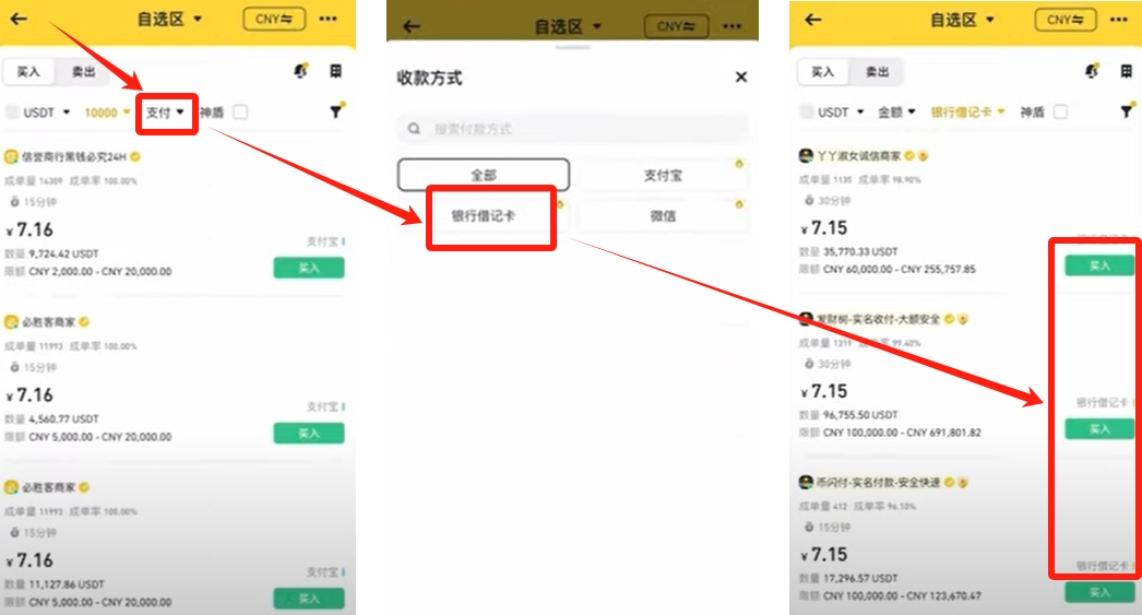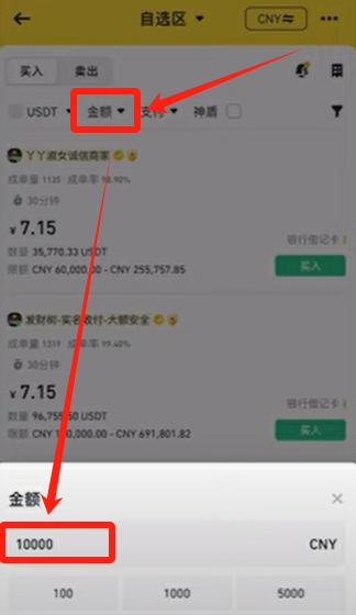 金额这个选项点一下就会筛选出能够直接和你交易的商家。比如我这里选择1万元,出来的商家都可以进行10000元的交易。