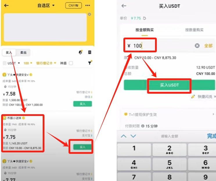 可以看到这些商家最低的限额都在100或者以下。我们选择第二个人,因为第一个人刚才我看了,他说不支持农行卡进行交易。点击他后面的【买入】,我们可以按照数量来购买,比如说你要买入20个USDT都是可以的。我们按照金额来购买100块,输入100,点击【买入USDT】。