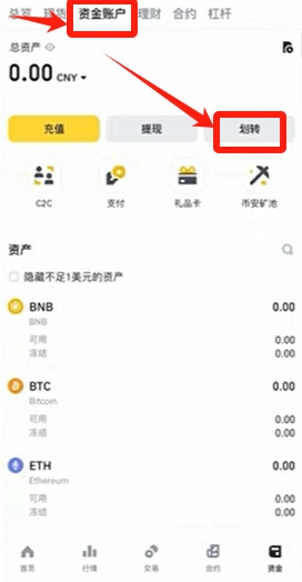 USDT是一个稳定币,他所谓稳定币就是跟美金1:1挂钩的,可能稍微有点溢价就,但是差别不是很大。它作为稳定币来说,不会类似于比特币、狗狗币这样,它的波动非常大。所以一般做中间的币使用。现在我们还不能交易买币,需要点击资金账户,然后点击【划转】。