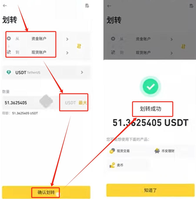把USDT从资金账户划转到现货账户。币种是USDT,数量选择最大。划转成功。