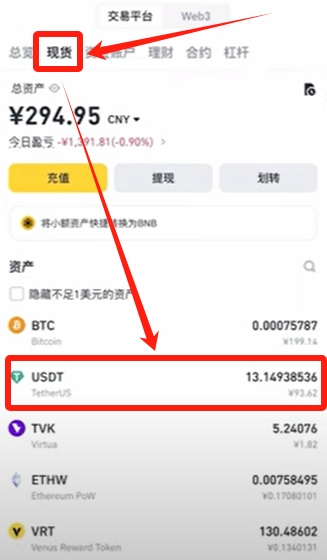 点击上方的现货账户。可以看到12.9个USDT已经在了。