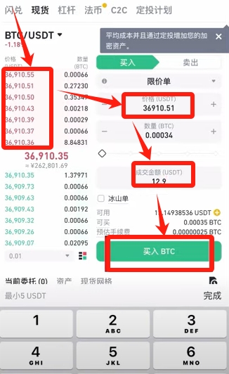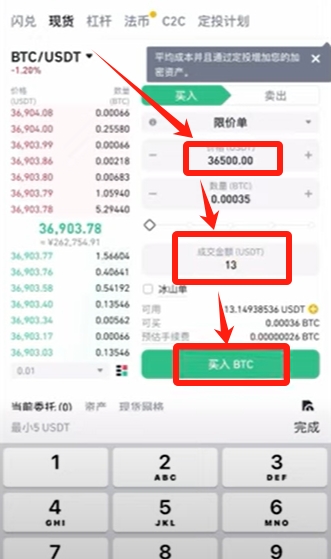 可以在价格这里输入一个我们想要的价格,例如36500美金,然后输入交易金额就是你想买多少钱的币,点击【买入BTC】。