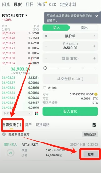 在下方【当前委托】这里,可以看到我们的单子。等到价格跌到了36500美金的时候,我们的单子就成交了。不想买就点击后面的【撤单】,就会取消这笔交易了。