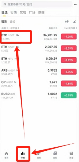 如果你想卖出BTC,可以还是像刚才一样,点击【行情】,上方选择“BTC/USDT”交易对。