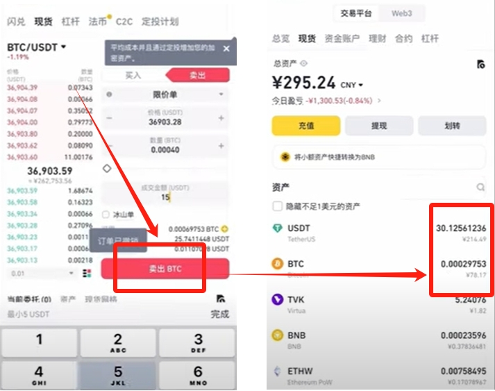 点击【卖出】,选择一个绿色的价格,确认成交金额,点击【卖出BTC】。