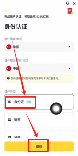 然后我们就到了身份认证的界面,接下来就需要进行身份认证了。如果你是国内的身份,可以使用身份证或者是护照来进行认证。推荐大家优先使用身份证来进行认证。然后点击【继续】。