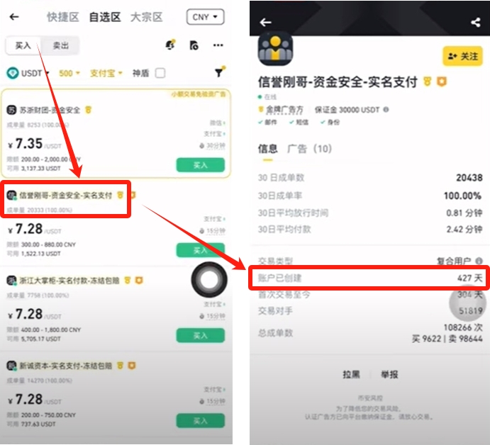 现在我们就可以来筛选一下商家来进行交易了。并不是谁给的钱最优惠就选谁,我们还是要选择安全的交易方的。比如说“信誉刚哥”这一家,他有一个2万单的成交量,他的好评率是100%。我们点击他的头像看一下,这家账户创建时间已经有一年多了,这种就是可以拉进行交易的。返回点击商家后面的【买入】。