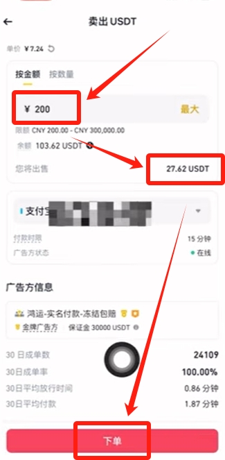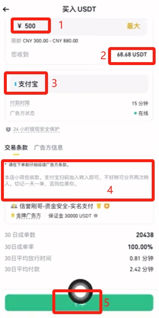 他会自动为我们算出来,支付500人民币将收到68.68颗USDT。我们的支付方式是“支付宝”。我们在订单的页面可以看到他具体的要求,他这里要求是小荷包收款,支付宝扫码转入就可以了,不要分开两次转入。然后我们点击下方的【下单】。