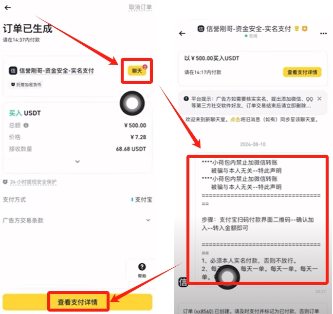 在聊天这里会弹出一个窗口,我们点进去来看一下。他告诉我们必须本人实名付款,否则是不放行的。然后我们返回,点击【查看支付详情】。