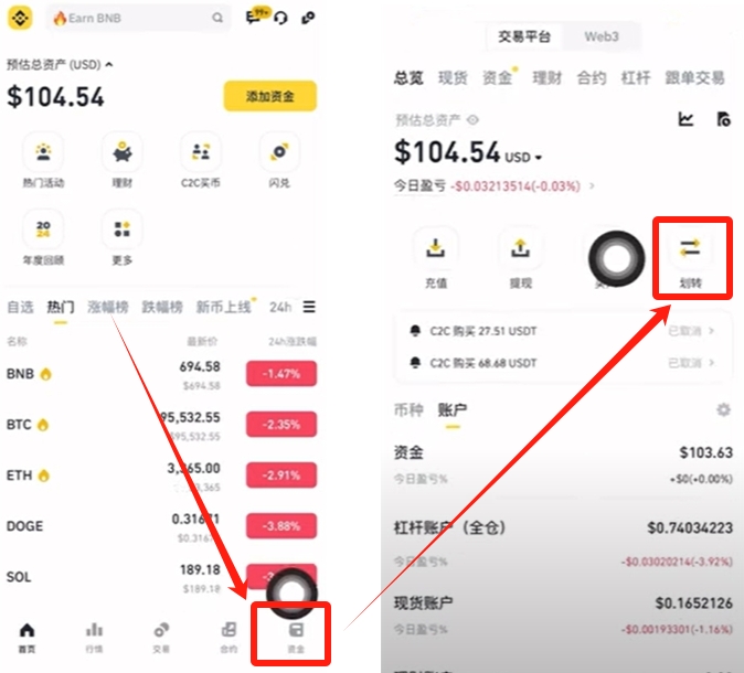 接下来我就来给大家演示一下,怎么在币安用USDT去购买比特币。我们首先点击右下角的【资金】,我们需要去做一个账户的划转,点击这里的【划转】。