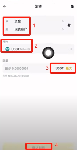 从资金账户到现货账户,币种选择USDT,全部划转,点击【确认】。