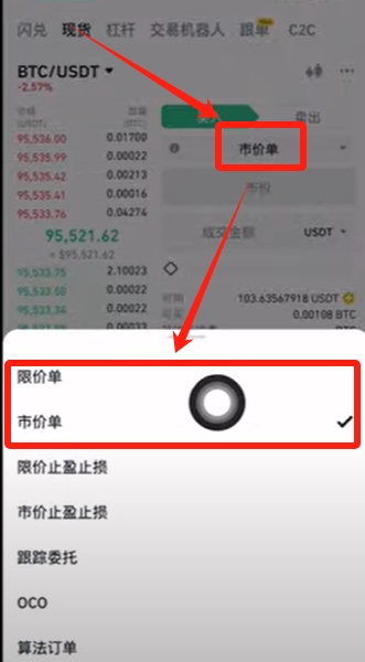 同样的道理,我来给大家再介绍一下,我们怎么来下单。我们下来选择下单的类型,这里有限价单和市价单,我们一般用的就是这个限价单和市价单。