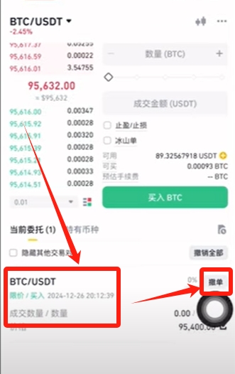 “限价单”的意思就是我们来报一个价,必须得跟这个价格差不多的时候才能够成交。比如现在的价格是95531,我们想以95400的价格来进行购买的话,你就可以在这里输入你想要购买的价格,然后输入一下你要购买的数量或者是金额,点击【买入BTC】就下单成功了。