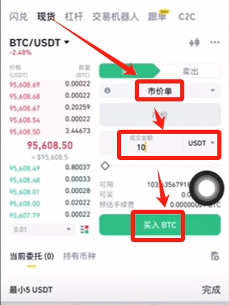 如果你现在就想购买的话,我们可以选择市价单。市价单就是能够立刻按照市场的行情来进行成交。我们输入要购买的金额,我们知道现在比特币的价格是很高的,但你其实并不需要买一个或者是0.1个,因为我们可以把比特币来切成很小的份,买个10U的、100U的都是可以的。比如说我在这里买10U的,就输入10,点击【买入BTC】直接就下单成了。