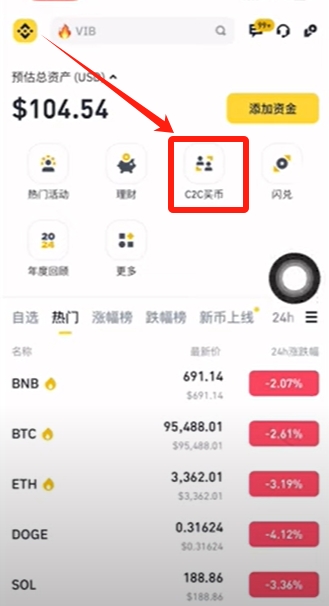 现在我们已经知道了怎么在币安里面交易加密货币?怎么把USDT变回法币,也就是完成出金呢?我们同样来到首页,点击【C2C买币】。