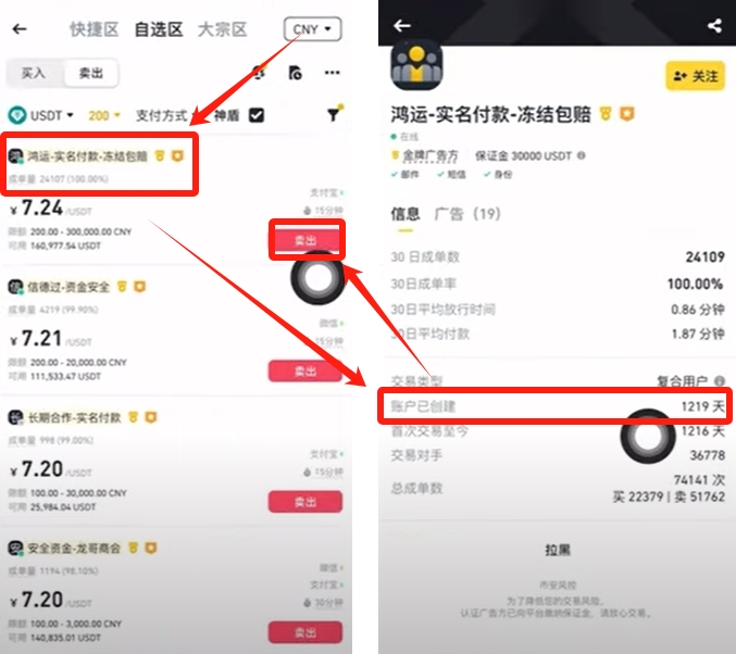 接下来我们还需要对这些商家再进行筛选,我们仍旧需要选择那些成立时间更久,成交率更高,成交量更大的来进行出售。比如说第一个“鸿运”这一家,我们来看一下他的注册时间,这个商家的账户创建已经有1219天了,已经有 4年多了。而且它的成交量和成交单数都比较高。我们就可以跟这家来进行出售,点击他后面的【卖出】。