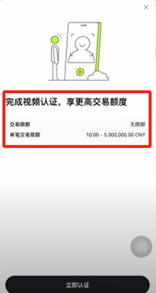 C2C视频认证就是让你再次根据他的提示,进行更高的视频认证。新手可以只做身份认证就可以了,足够满足日常的需求。如果你在入金的时候,它提示你的权限不足,就需要进行C2C视频认证了。视频认证做完之后,基本上就是无限额的。