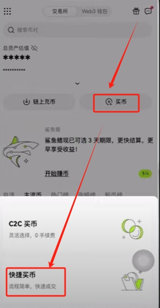 返回到主页,点击【买币】,这里有C2C买币和快捷买币。“C2C买币”就是大小金额都可以,并且是自选商家。“快捷买币”比较适合小金额的,是系统自动给我们匹配商家。其实两个功能都是提供给我们,让我们用人民币来买USDT的。