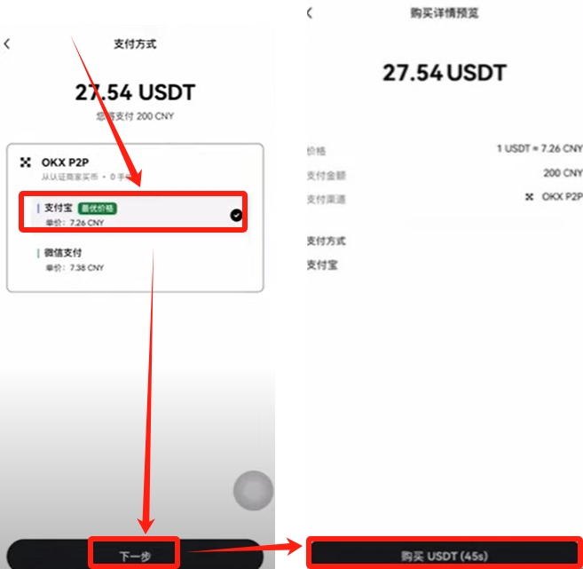 里面有支付宝、微信、银行卡。我这里没有绑定银行卡所以没有显示。可以看到支付宝的报价是最优的,所以我们就选择【支付宝】。当然也会有银行卡或者微信支付的方式。点击【下一步】,再点击【购买USDT】,系统就会自动为你匹配商家。