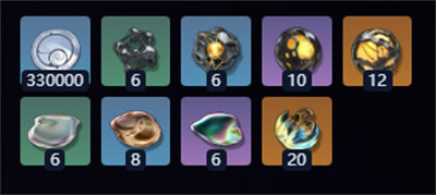 贝币×330000、低频啸叫声核×6、中频啸叫声核×6、高频啸叫声核×10、全频啸叫声核×12、惰性金属液滴×6、活性金属液滴×8、极化金属液滴×6、异构金属液滴×20