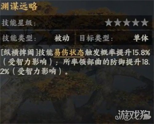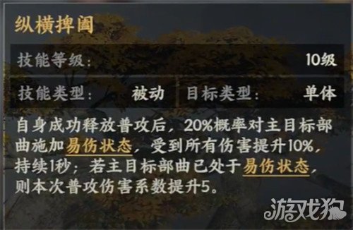 纵横捭阖属于它的被动技能,单体对抗时可以作为优先的技能进行使用。当自身释放出普攻后,拥有20%的概率可以直接对目标部曲释迦易伤状态,如果敌方已经处于易伤的状态,本次释放普攻后将会把伤害的系数提升至5,从而增加更多的额外伤害。定谋贵决也是他被动技能的核心部分,技能等级达到10级时释放普攻后,能够拥有50%的概率提升部曲防御能力,并且以三秒钟作为持续时间,等级越高时,普攻的伤害就会随之增强。
