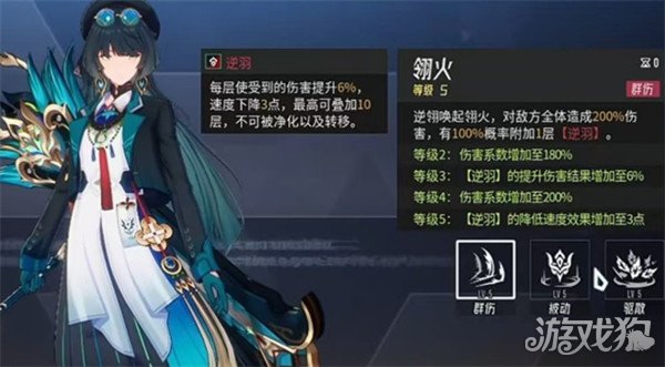逆翎在伊瑟中的定位偏向功能型辅助,擅长通过削弱敌方战斗力来为己方创造输出环境。他的一技能能够对全体敌人造成伤害,并附加逆羽效果。逆羽可进行多层叠加,每叠加一层都会提升目标所受到的伤害量,同时降低其行动速度。这一机制使得敌方不仅输出效率下降,出手频率也会被压制,为我方争取更多行动机会,尤其在面对高爆发或高速度对手时,逆翎的一技能能有效打乱对方节奏。