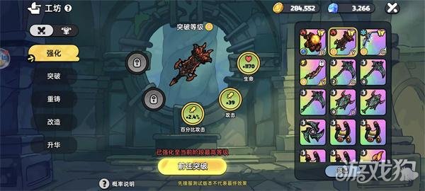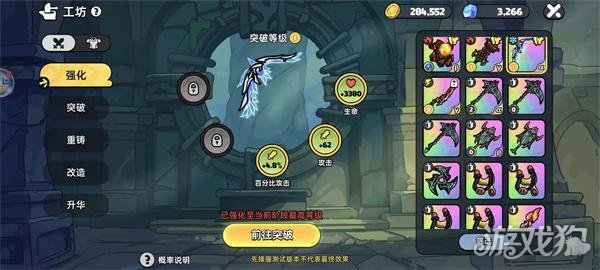 强化只能强化神话武器(就是彩色武器),强化进度满后,通过(突破)解锁新的强化属性。