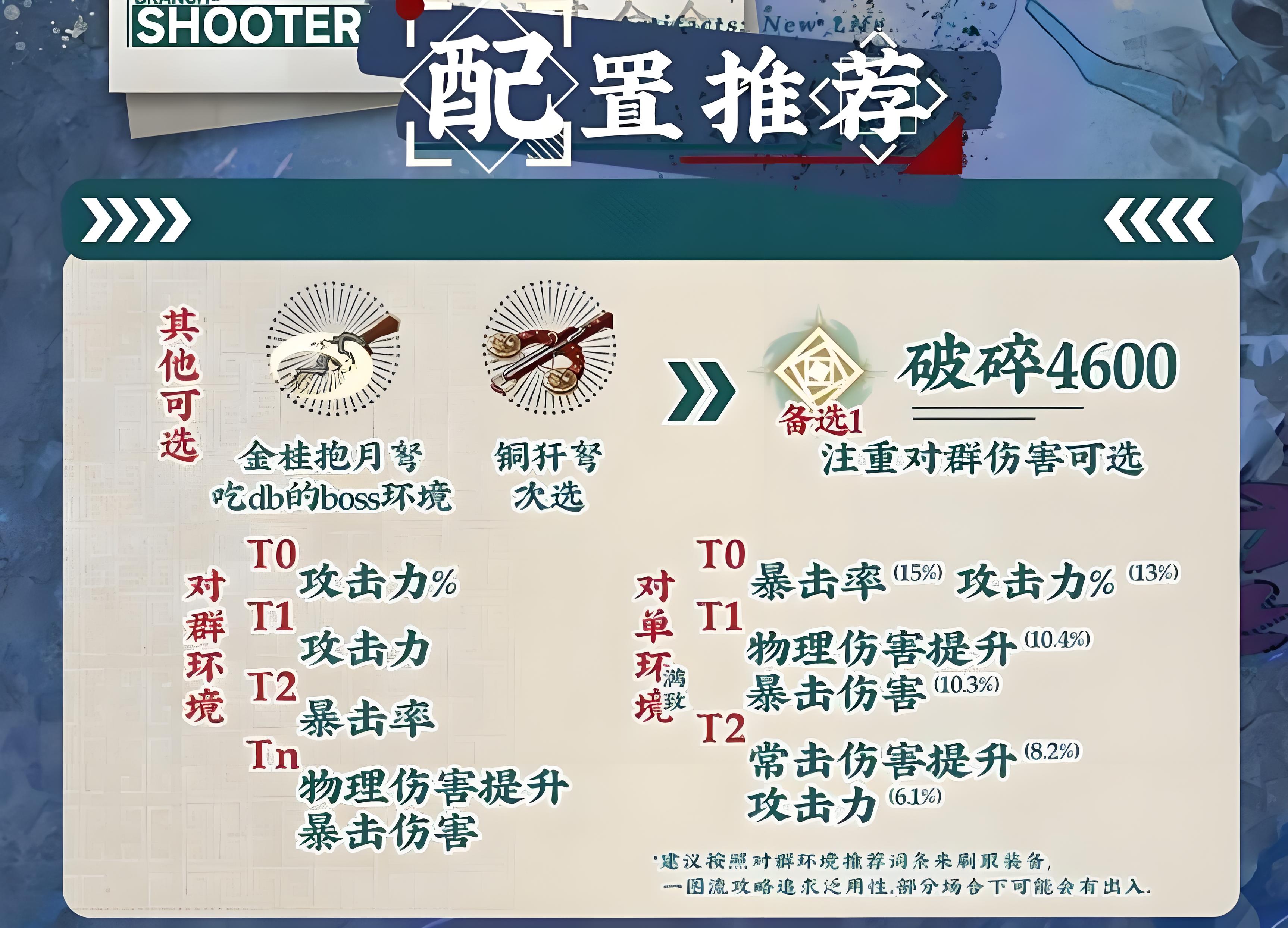 2、养成需选适配装备,通用武器选流云鸣沙弩对群选金桂抱月弩对单选铜犴弩,词条按环境侧重攻击暴击率等属性刷取。