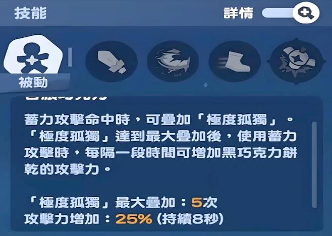 1、被动极度孤独靠蓄力攻击叠五层,满层八秒攻击力翻倍,普攻不叠加,蓄力攻击有1点2倍基础伤害,稳定叠层保层数是核心。