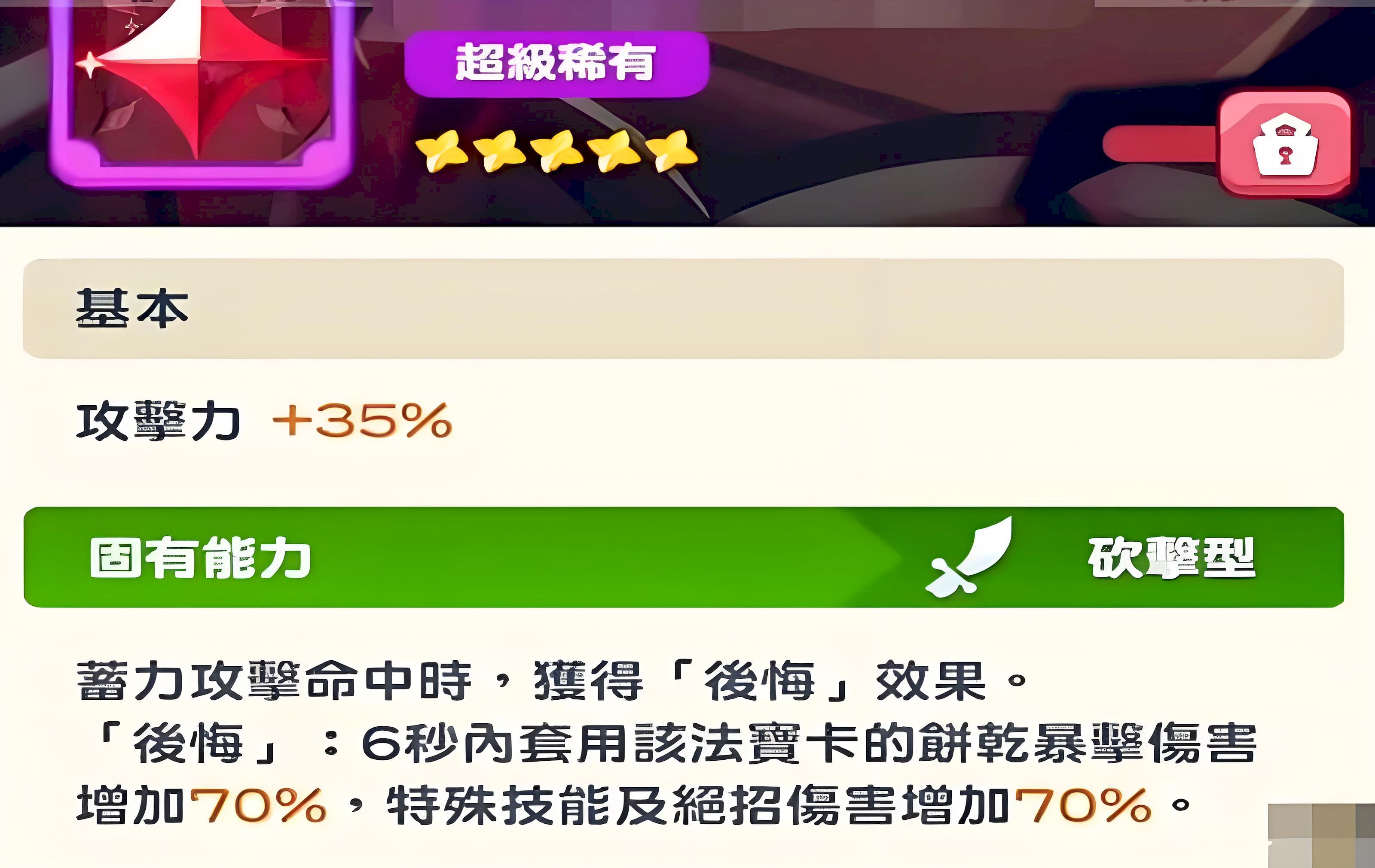 4、核心法宝卡后悔适配高,蓄力命中后六秒暴击伤害和技能伤害升70%,叠被动后输出近三倍增幅,提升战斗伤害表现。