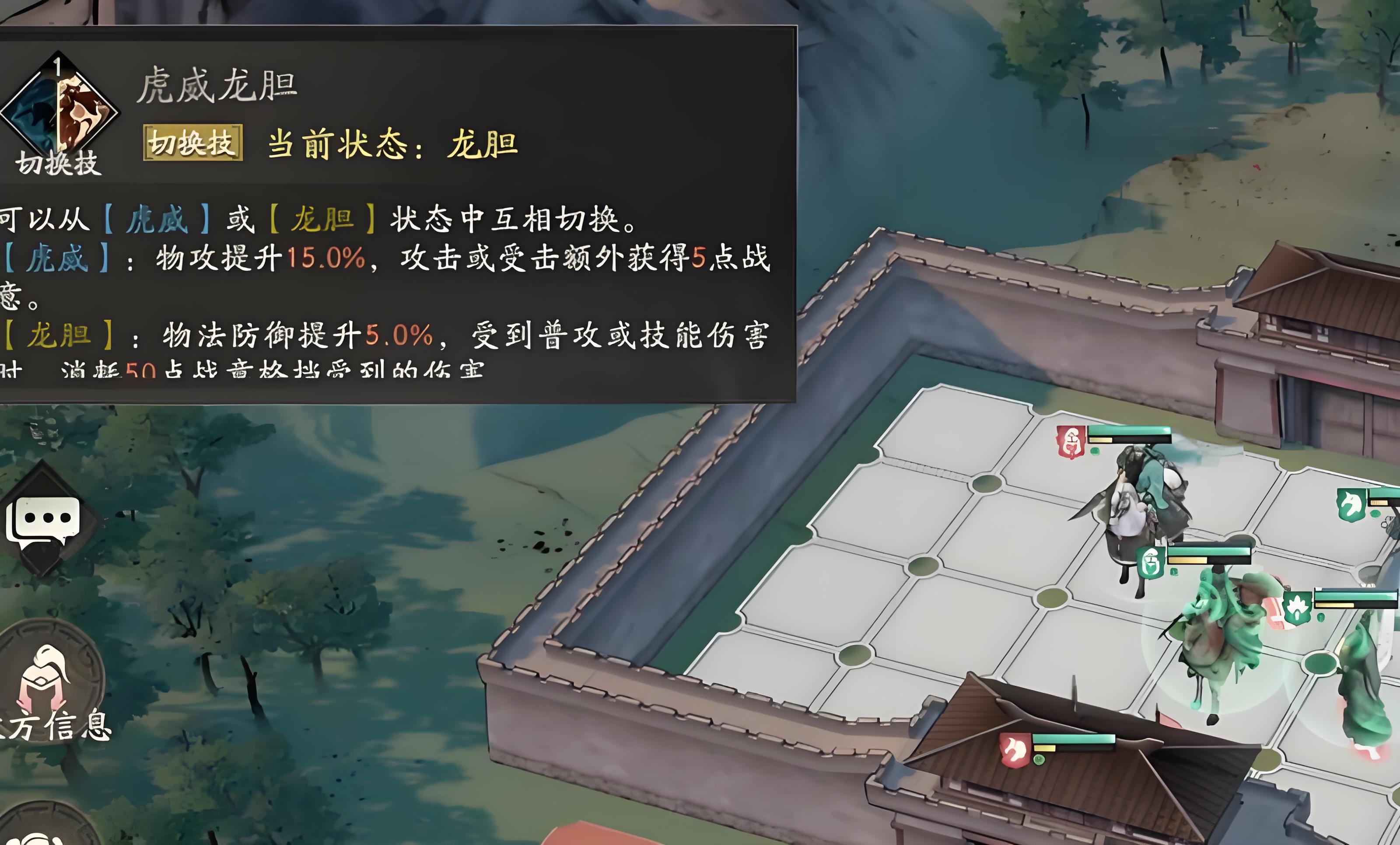 3、主动技能虎威龙胆可切换状态,虎威态物攻升15%且攻防额外得5点战意,龙胆态双防升5%且耗50点战意挡一次伤害,切换无冷却能应变。