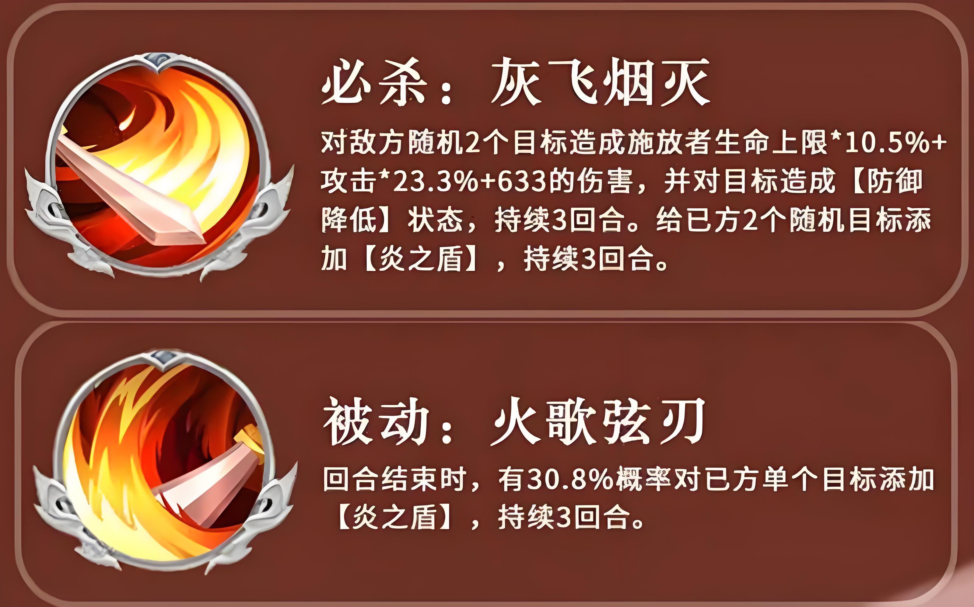 2、必杀技灰飞烟灭对敌方随机2目标造成伤害,含生命上限10点5%、攻击23点3%及633固定伤害,还使目标防御降低3回合,同时给己方随机2目标加炎之盾。