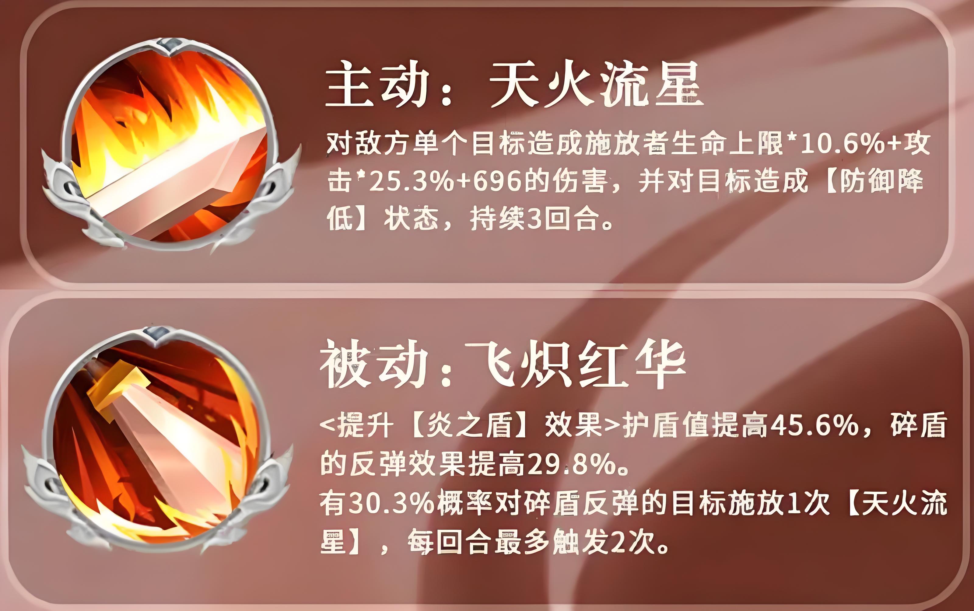 4、被动技能火歌弦刃使回合结束时30点8%概率给己方单个目标加炎之盾,被动飞炽红华提升炎之盾效果,护盾值提高45点6%且碎盾反弹效果提高29点8%。