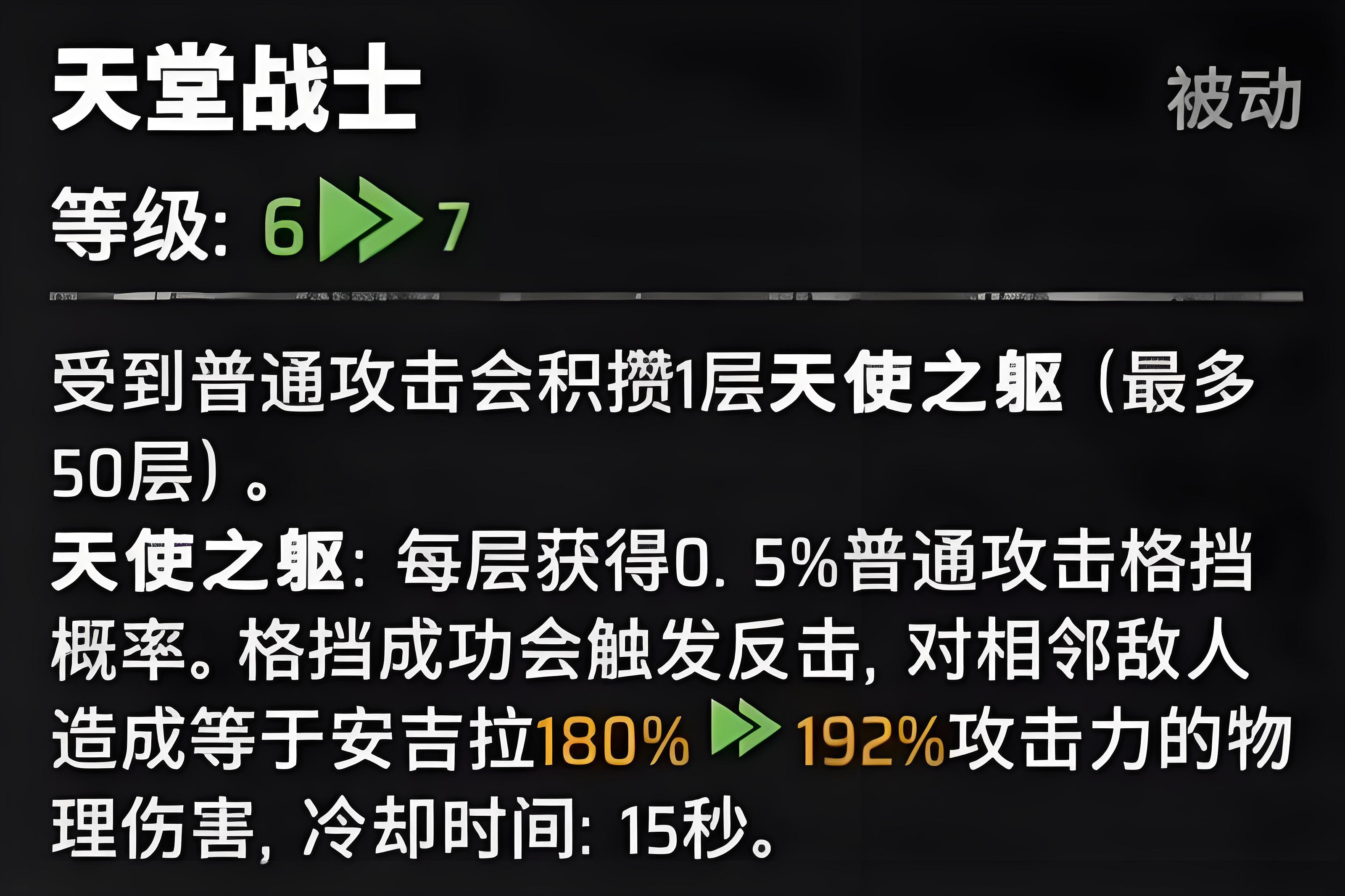 1、天赋天堂战士是核心防御反击机制,受普攻叠天使之躯最多50层,每层加0点5%普攻格挡概率,格挡成功对相邻敌人造成192%攻击力物理伤害。