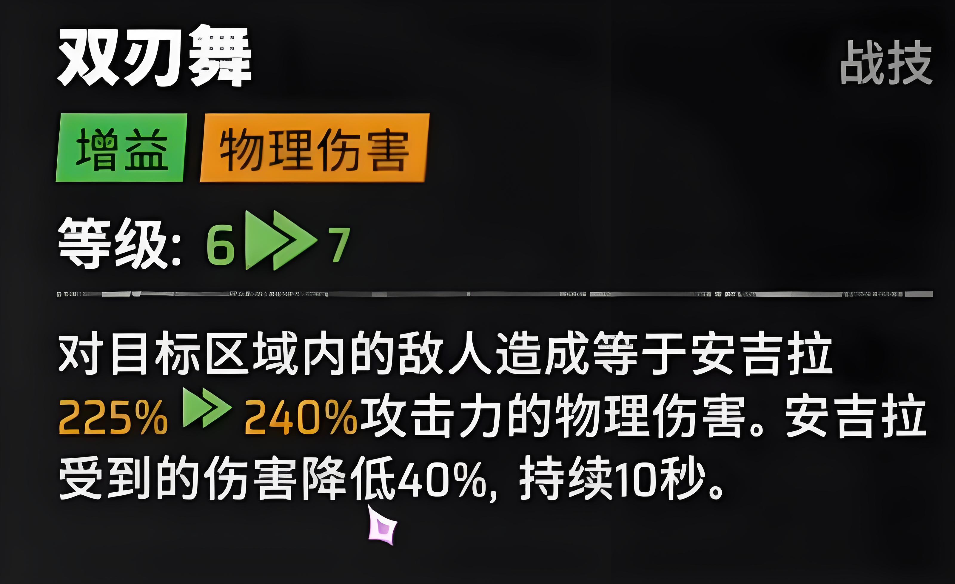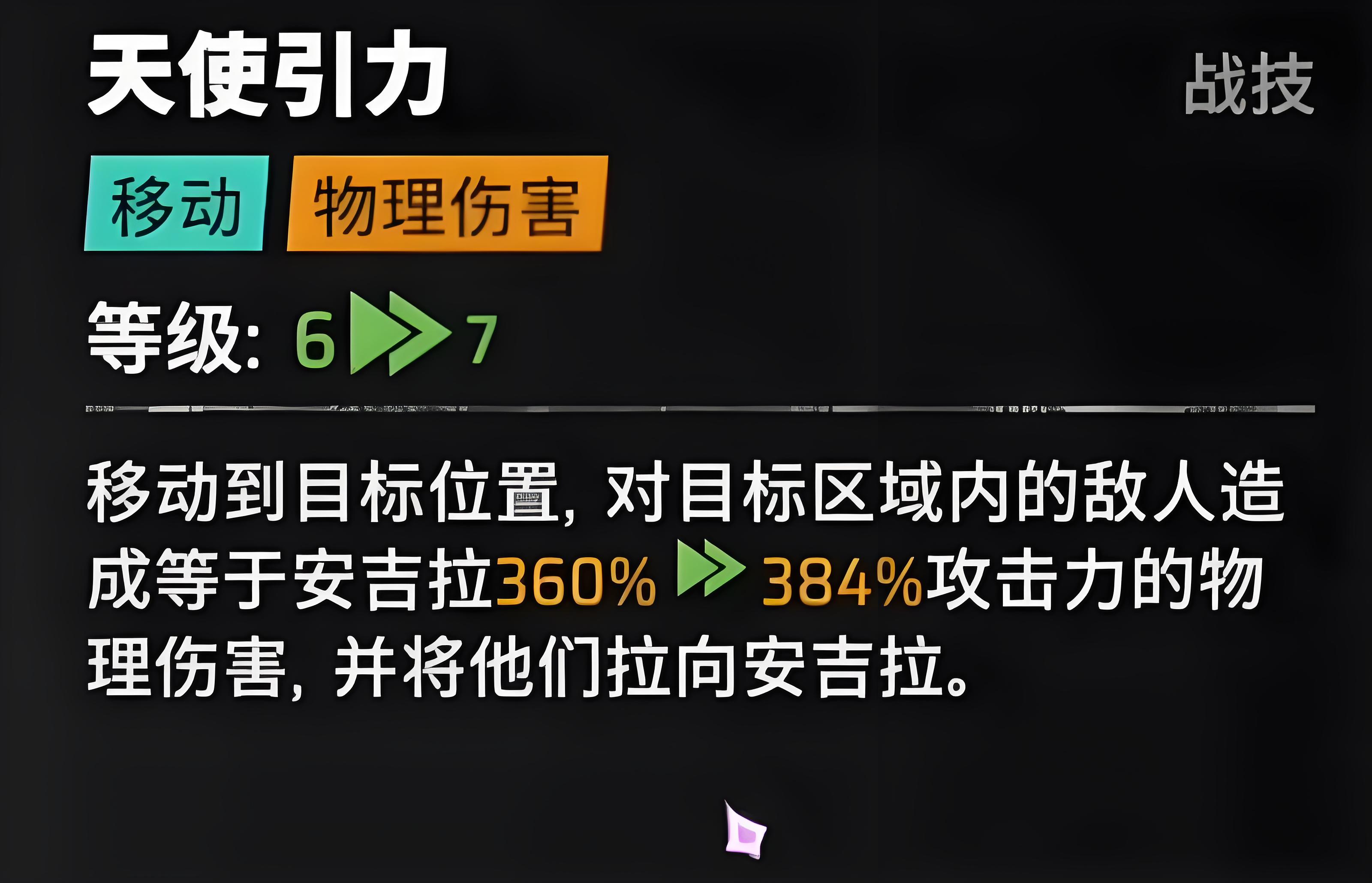 2、战技分两类天使引力移至目标区域,对3乘3区域敌人造成384%攻击力伤害并牵引聚拢,双刃舞对区域敌人造成240%伤害且自身减伤40%持续10秒。