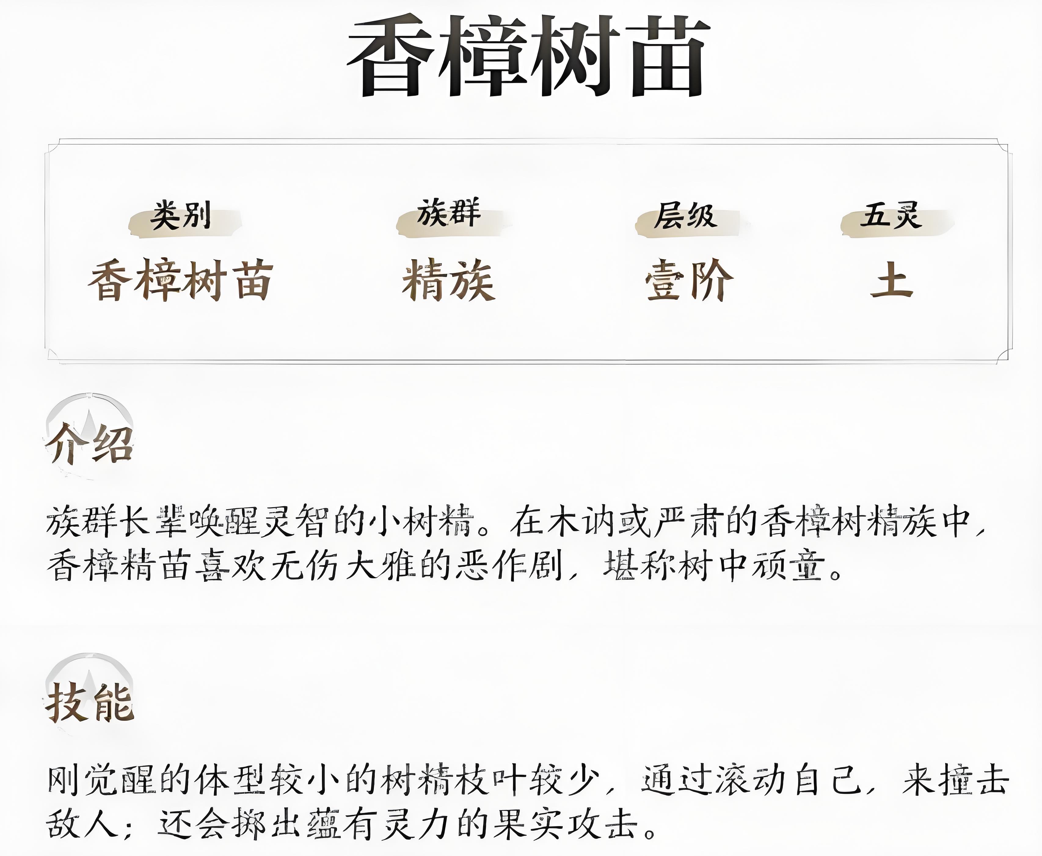 仙剑世界香樟树苗作为常见的壹阶土属性精怪,虽外表娇小但在战斗与探索中都有独特价值,不少玩家想深入了解其具体用途、能力特性及实用技巧。本文将详细介绍其战斗攻击方式、特殊干扰能力、分布区域特点及培养相关要点,帮助玩家全面掌握这一精怪的作用与使用信息。