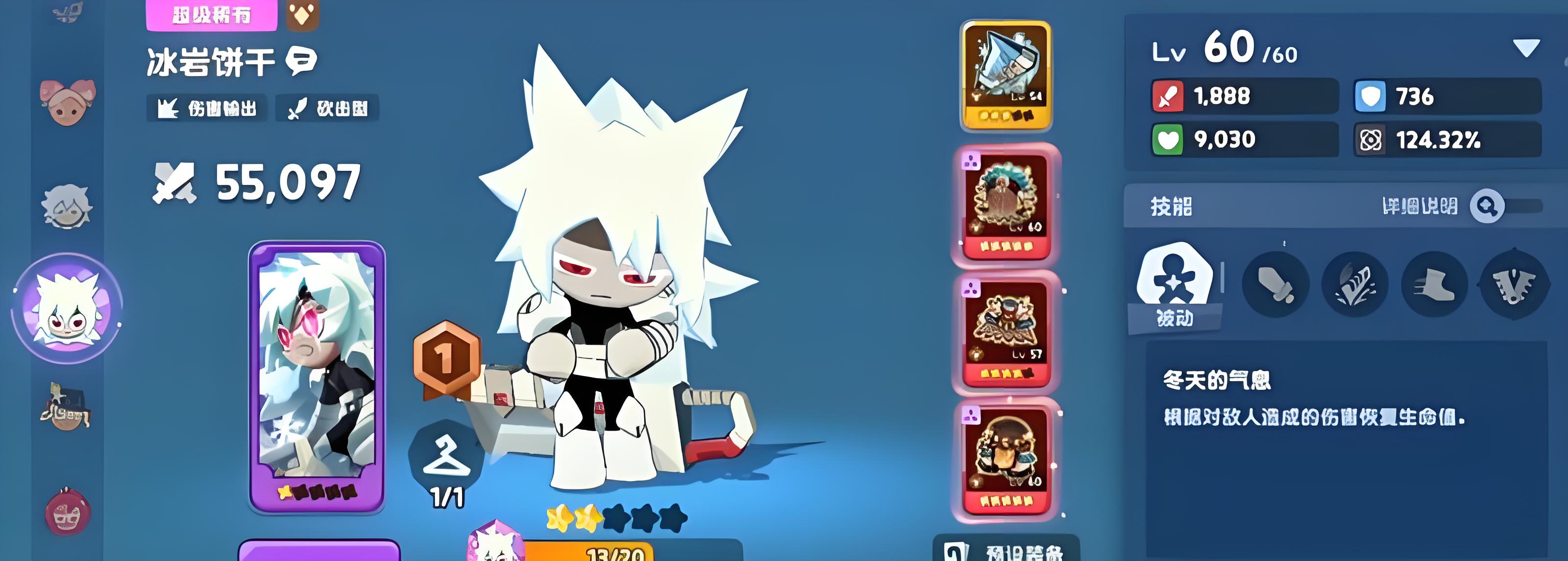 1、冰岩饼干定位土属性高爆发输出,60级攻击力1888属性加成124点32%输出优秀,防御736生命值9030生存弱需治疗或护盾保护。