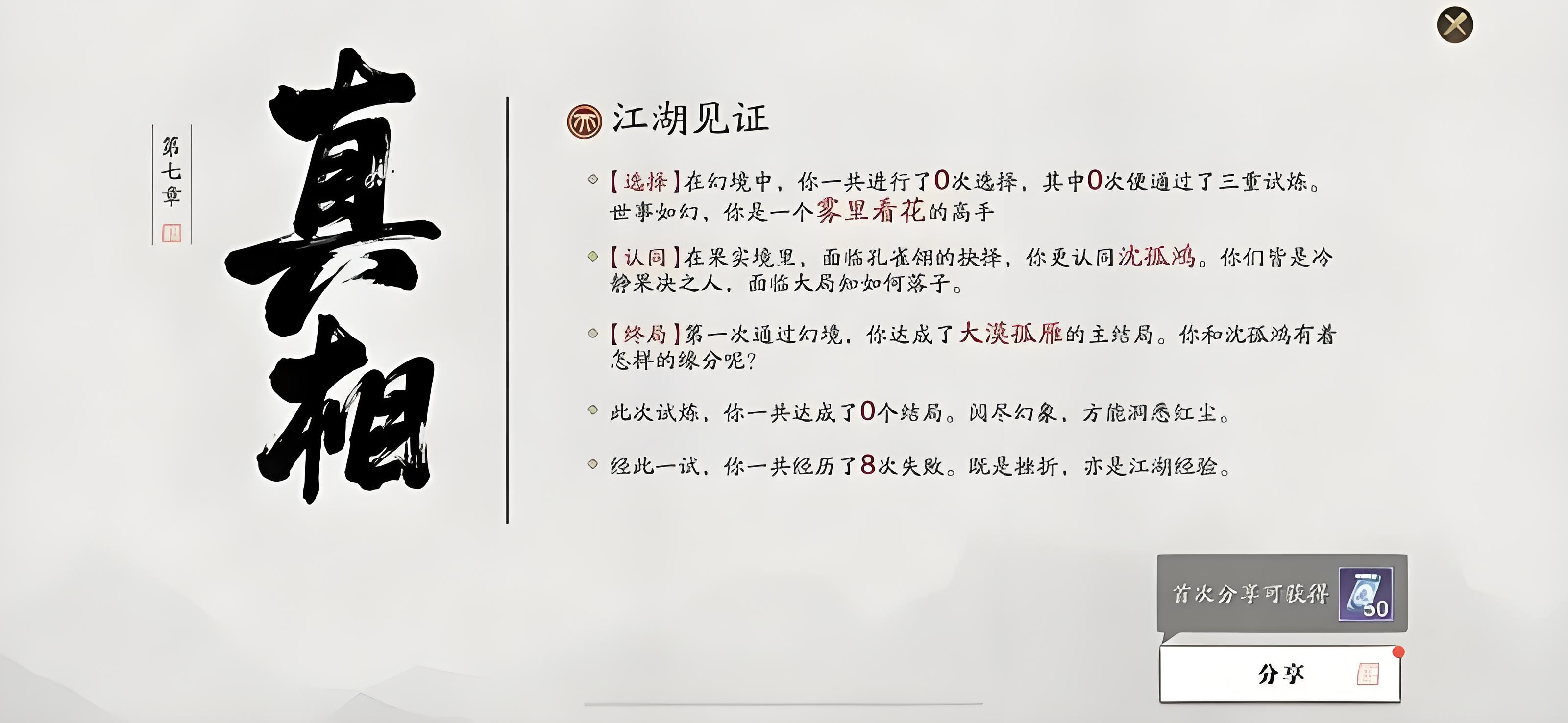 1、开启需先满足第一个前置条件,即完成第七章主线任务,该章节需玩家等级达到65级才能开放,完成后可直接跳过剧情解锁结局。