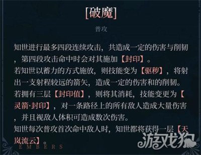 在技能上面,知世使用的武器叫做天岚流云箭,这是一把玉虚院家族里面的人才能使用的武器,在输出的时候一般都会带上庇佑的效果,在一下中使用技能的时候,知世可以带来一个叫做破魔的普攻,在进行普攻攻击的时候最多是可以带来4段连续攻击的,而且可以造成一定伤害之后还可以给敌人带来削刃的效果,在第4段攻击里面,她还可以给敌人施加一个封印的能力,如果此时以蓄力的方式进行技能使用,这个技能还会变成驱秽的效果,射出一支射程相比普攻来说更远一些的箭矢造成伤害。