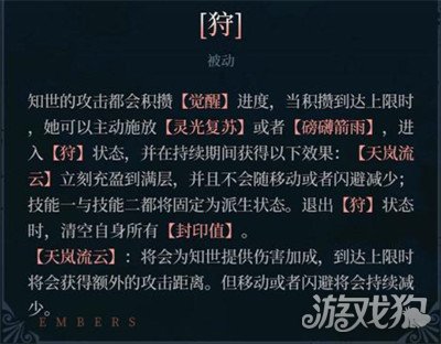 知世的被动叫做狩,就是在攻击的时候只要达到了一定的觉醒进度,那么此时积攒达到上限数量的时候,她就可以主动释放灵光复苏的技能,或者是使用磅礴剑雨这个技能,此时的话就会进入这个被动的状态,也就是狩状态里面,只要是在这个被动状态里面,知世就可以获取天岚流云的效果,这个状态会立刻冲到满层的效果,并且不会随着角色移动或者是闪避来减少数值,技能1以及技能2的话,此时都会变成派生状态。