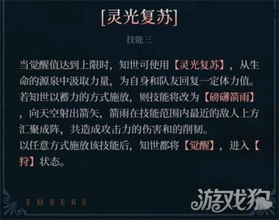 她的技能3叫做灵光复苏,也就是在觉醒值达到一定上限之后,就可以使用这样的灵光复苏带来一定的恢复效果,这里恢复的体力数值是给自身以及队友同时进行恢复的,如果前期有蓄力的话,那么这个技能就会变成磅礴剑雨的效果,剑雨技能范围之内生效的话,对敌人都会造成一定的阵法输出,同时造成攻击力伤害和削刃的效果,这个技能在释放之后只是将进入一个觉醒的状态,也可以触发她的被动效果。