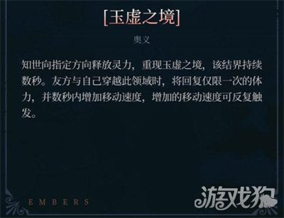 在她的大招上面叫做玉虚之境,使用这个大招的时候是需要灵力的,那么在消耗了灵力之后,就会出现一个境界,这个结界持续时间很长,主要是队友和知世自己进入这个领域里面的话,直接就会触发恢复的效果,并且再一次体力数值恢复,并且在后续几秒之内,她的移速也会得到一定的增强,且这个移动加速是可以反复触发的。