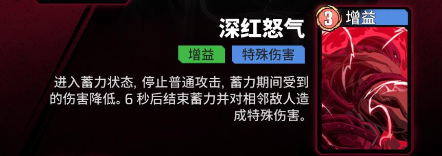 2、深红怒气是战技,进入蓄力状态停止普通攻击,蓄力期间受伤害降低,6秒后对相邻敌人造成特殊伤害,41级解锁加成增加伤害且克制高攻速敌人。
