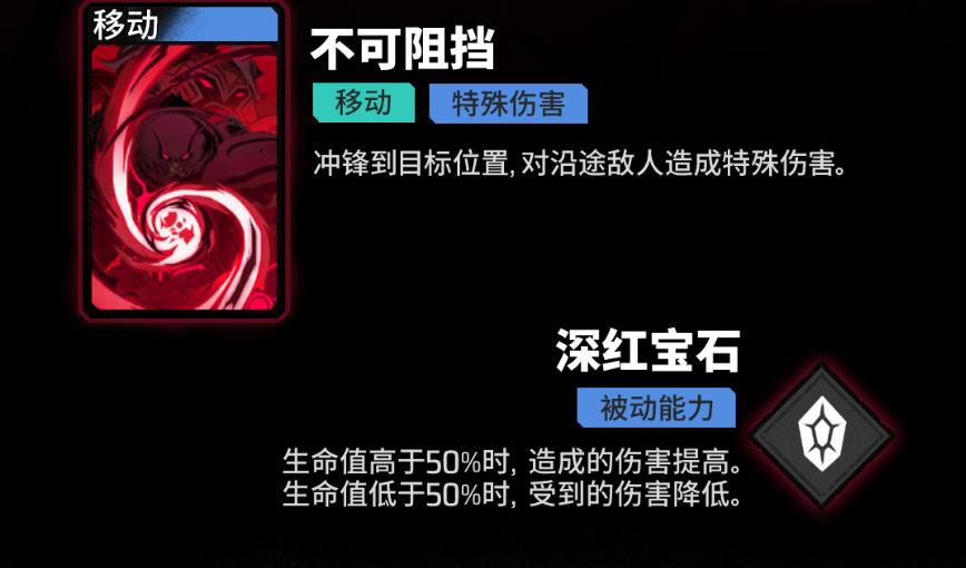 4、深红宝石是被动能力,生命值高于50%时伤害提高,低于50%时受伤害降低,实现优势增伤劣势提坦度的效果适配不同战场局势。