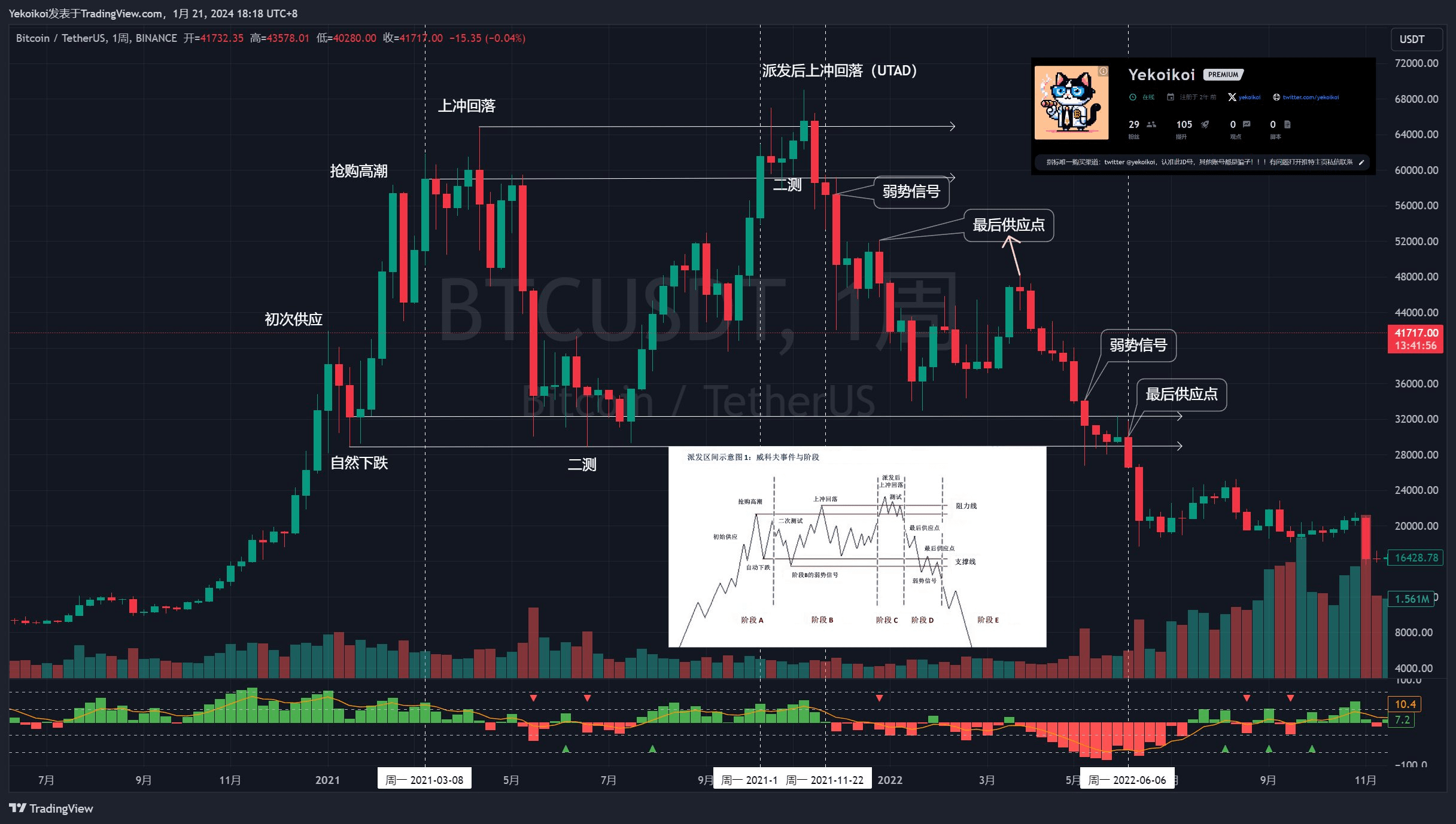 进阶篇,以上一轮BTC牛市周线级别派发做案例,因为上一轮的BTC派发是标准的教科书级别派发形态,简直和威科夫派发形态一模一样,几乎走完了所有的派发量价行为,全文一共6000字的派发详解,派发比吸筹更难识别,原因在于整个市场都是 fomo状态,狂热状态,全面看好,大牛市,BTC将要去100万,我作为韭菜也无法避免会遭受狂热情绪的侵袭,会对于市场的阶段错误识别,一方面害怕踏空,一方面害怕回调。
