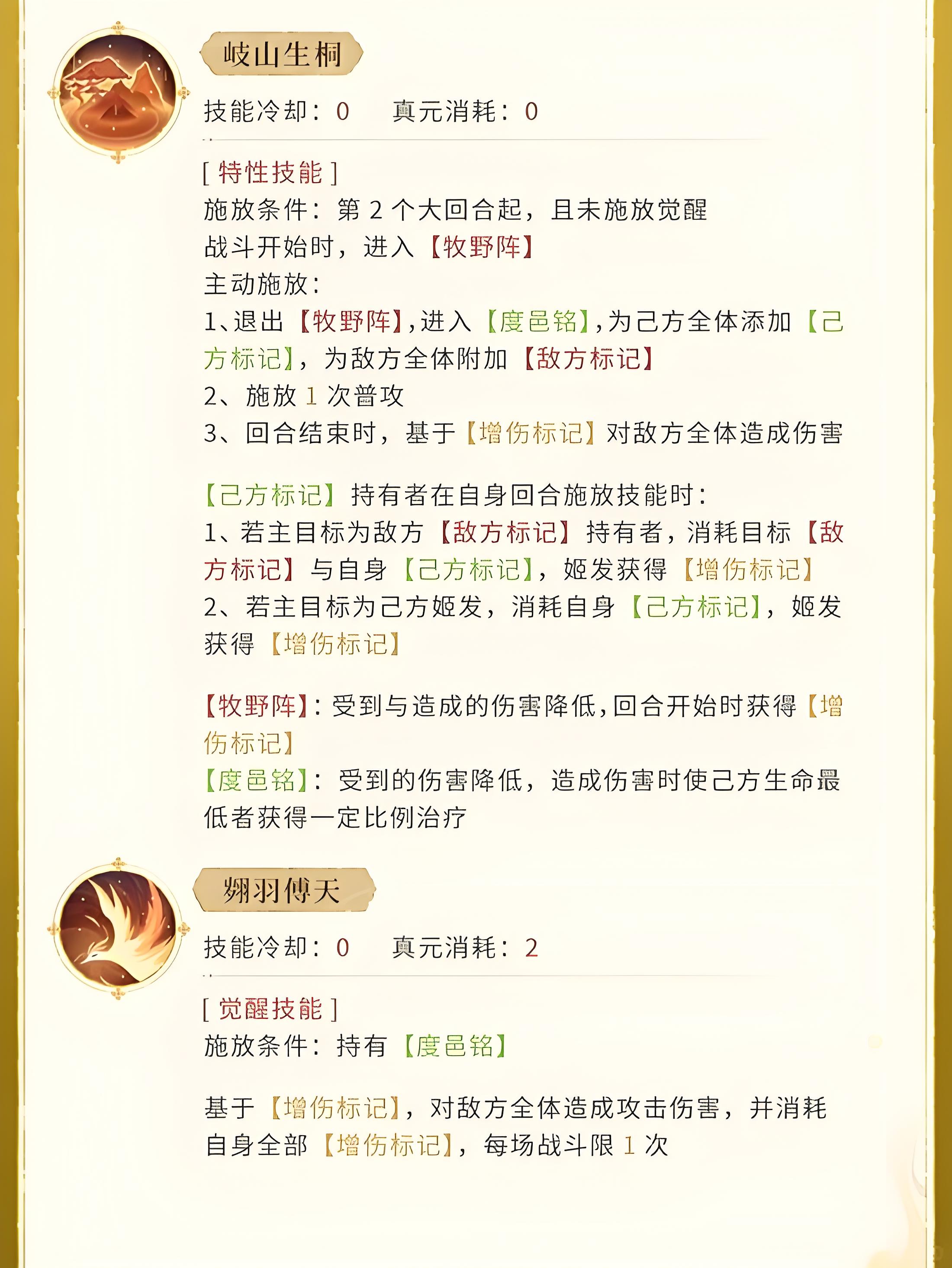 1、特性技能岐山生桐无冷却无真元消耗,主动施放后转度邑铭,为己方全体加己方标记、敌方全体加敌方标记。