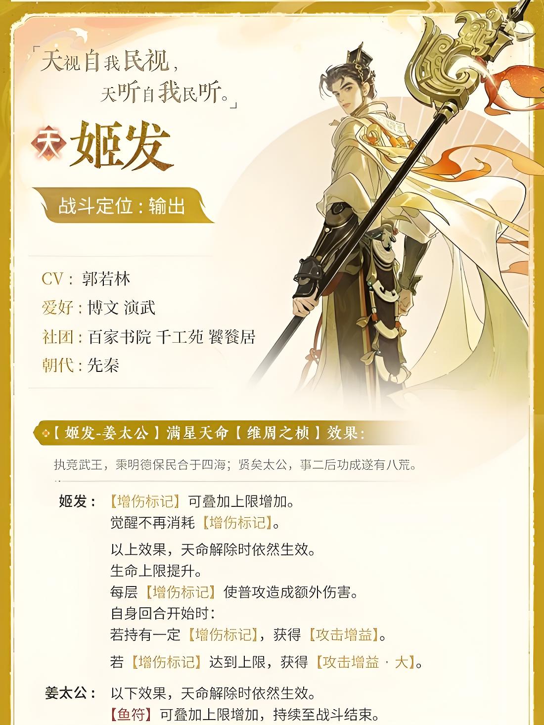 忘川风华录新名士姬发技能设计围绕其建立周朝的历史背景展开,融入牧野之战等战斗元素,作为输出名士拥有独特的标记机制与形态切换能力,许多使君想提前了解其技能效果、形态特性及天命加成,以便预判阵容适配性与使用策略。本文将详细介绍姬发的特性技能、标记作用、形态效果及满星天命,帮助使君全面掌握这位新名士的核心能力。