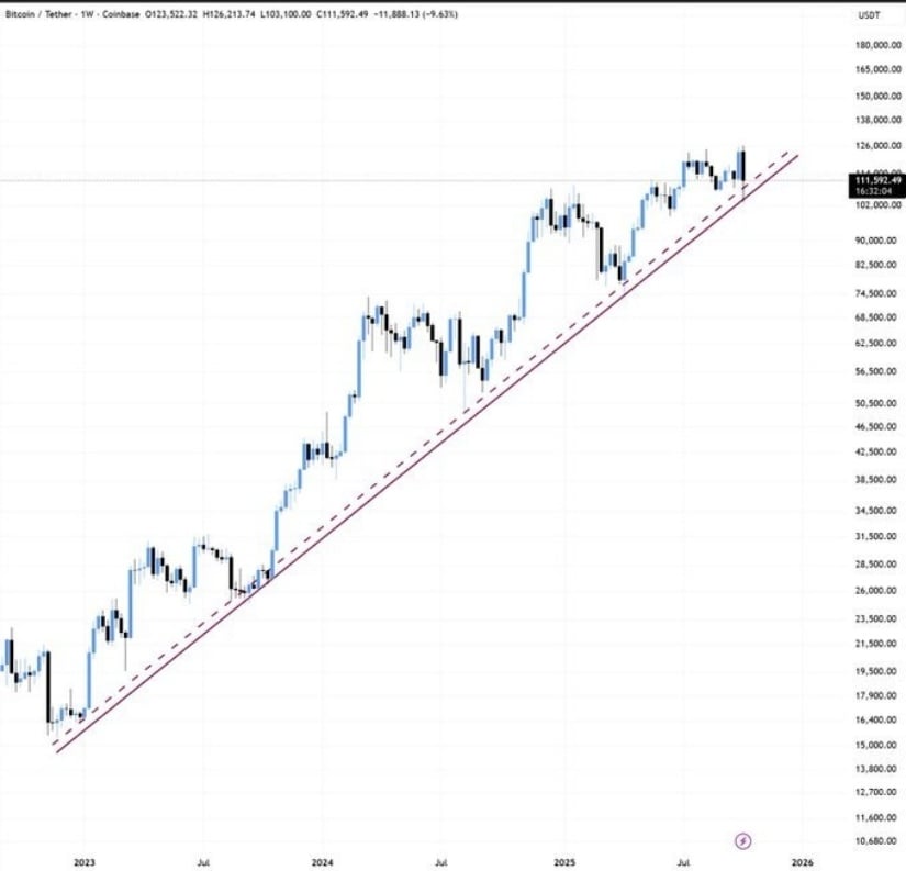 当前最重要的信号之一是比特币周线趋势线。这条自2023年20,000美元低点形成的上升趋势线始终充当强力支撑。2025年10月12日,比特币虽下探至109,715美元,但最终收于115,170美元——远高于11万美元关键支撑位。